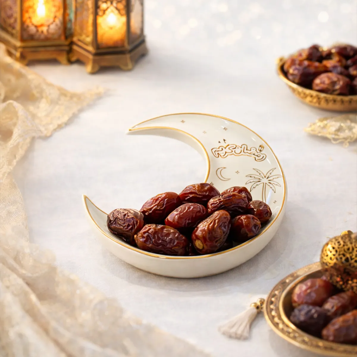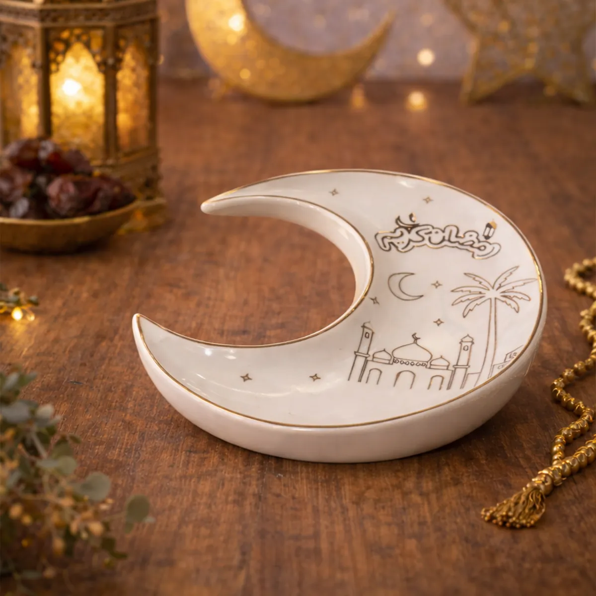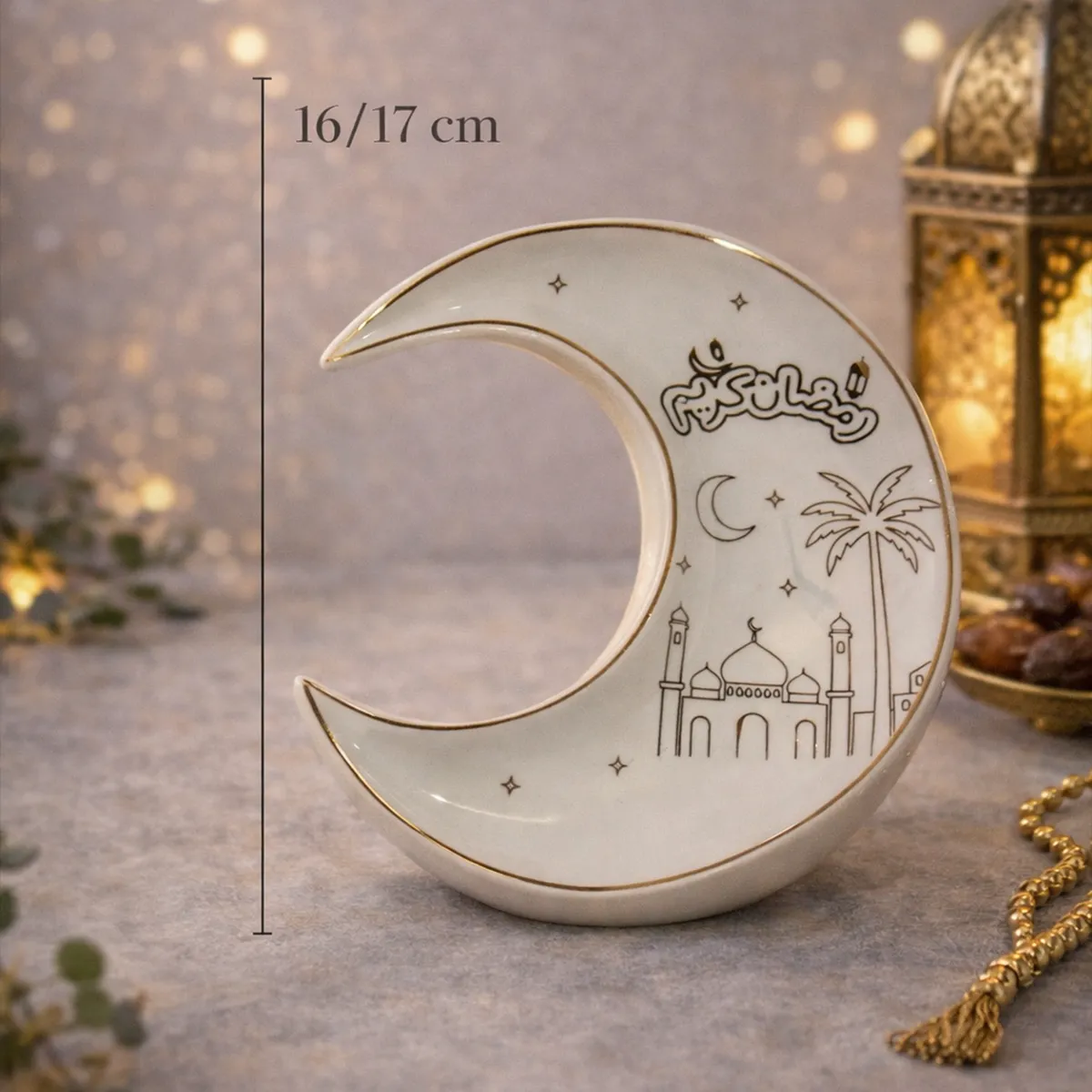 يأتي الصحن بلونه العاجي الهادئ مع حواف ذهبية لامعة ورسومات عربية أنيقة تضفي عليه طابعًا احتفاليًا فريدًا يليق بمائدة الإفطار والسحور. تصميمه الهلالي يجعله قطعة مميزة تجمع بين الجمال والرمزية، ليكون أكثر من مجرد صحن تقديم… بل جزءًا من أجواء رمضان في منزلك.