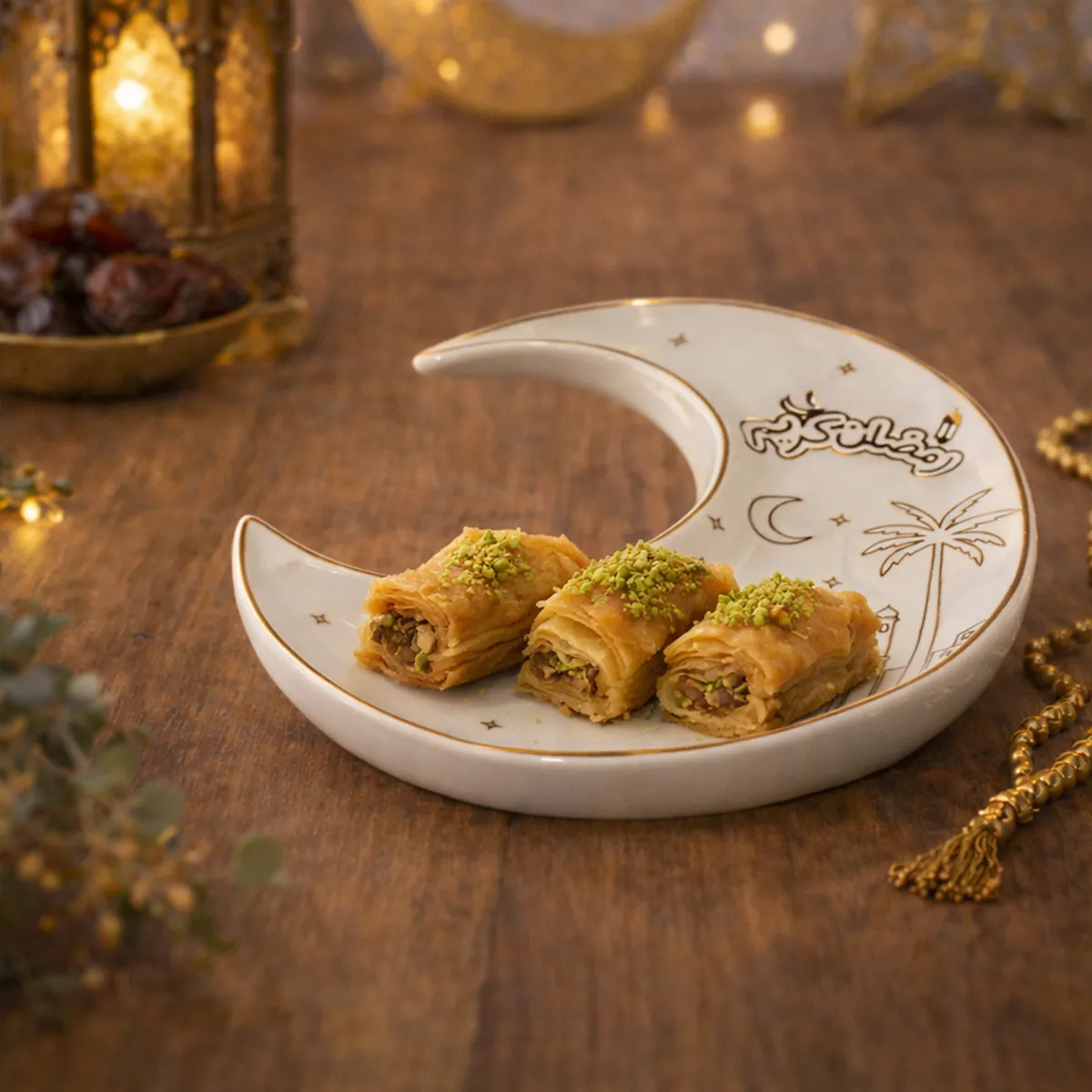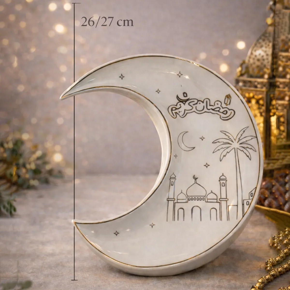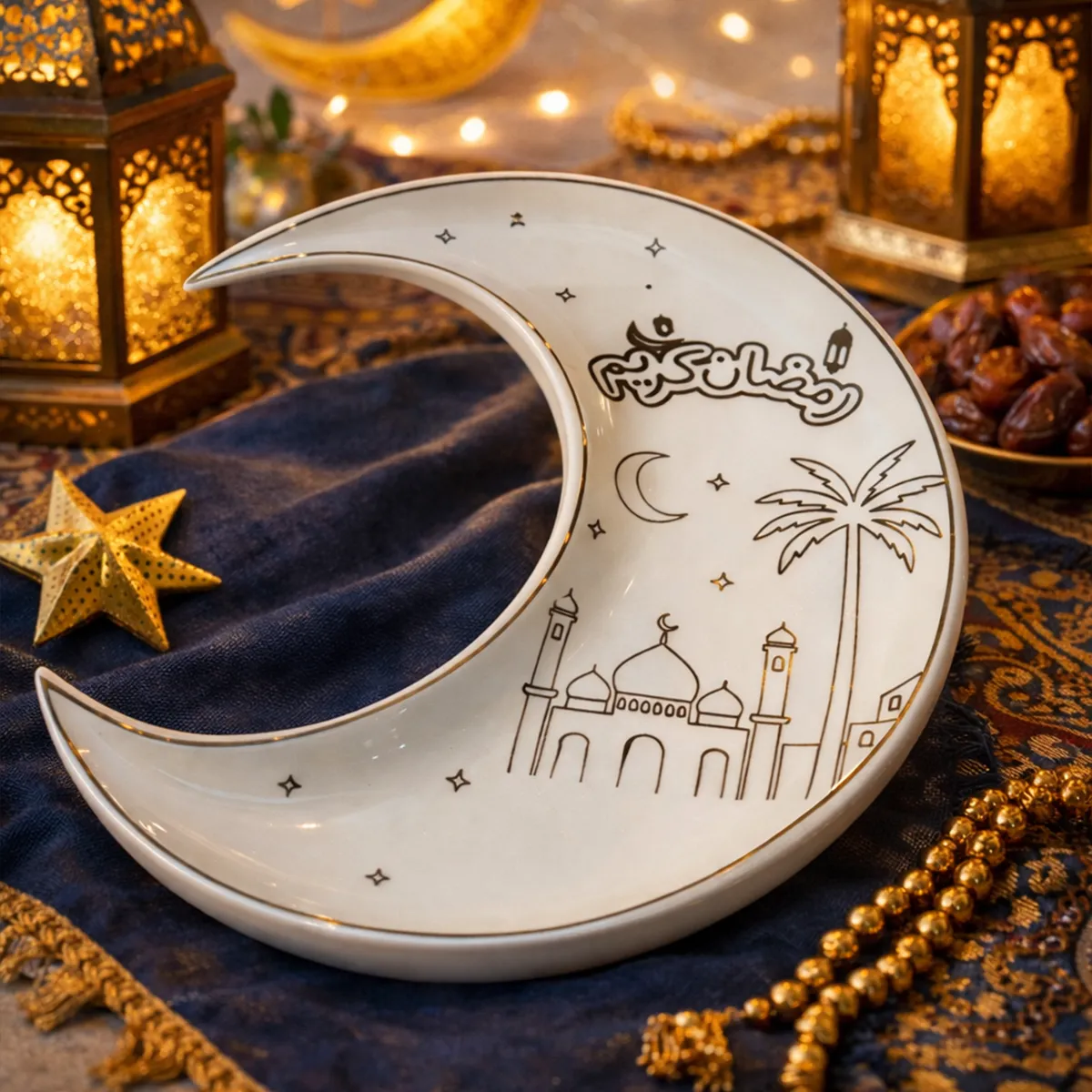 يأتي بلونه العاجي الراقي مع حواف ذهبية لامعة ورسومات عربية أنيقة تمنحه طابعًا احتفاليًا مميزًا يليق بمائدة الإفطار والسحور. تصميمه الهلالي يجعله قطعة ملفتة تجمع بين الجمال والرمزية في آن واحد.