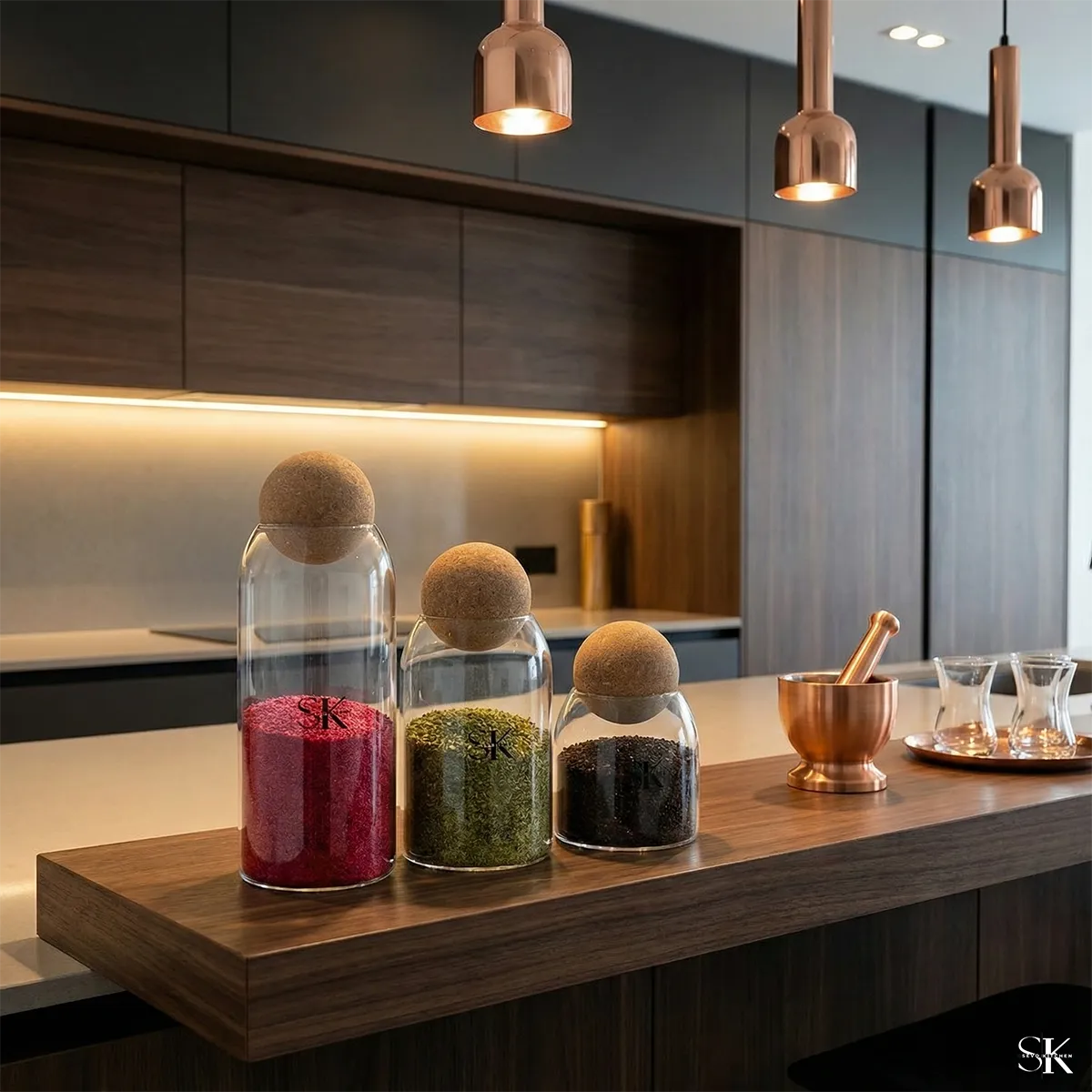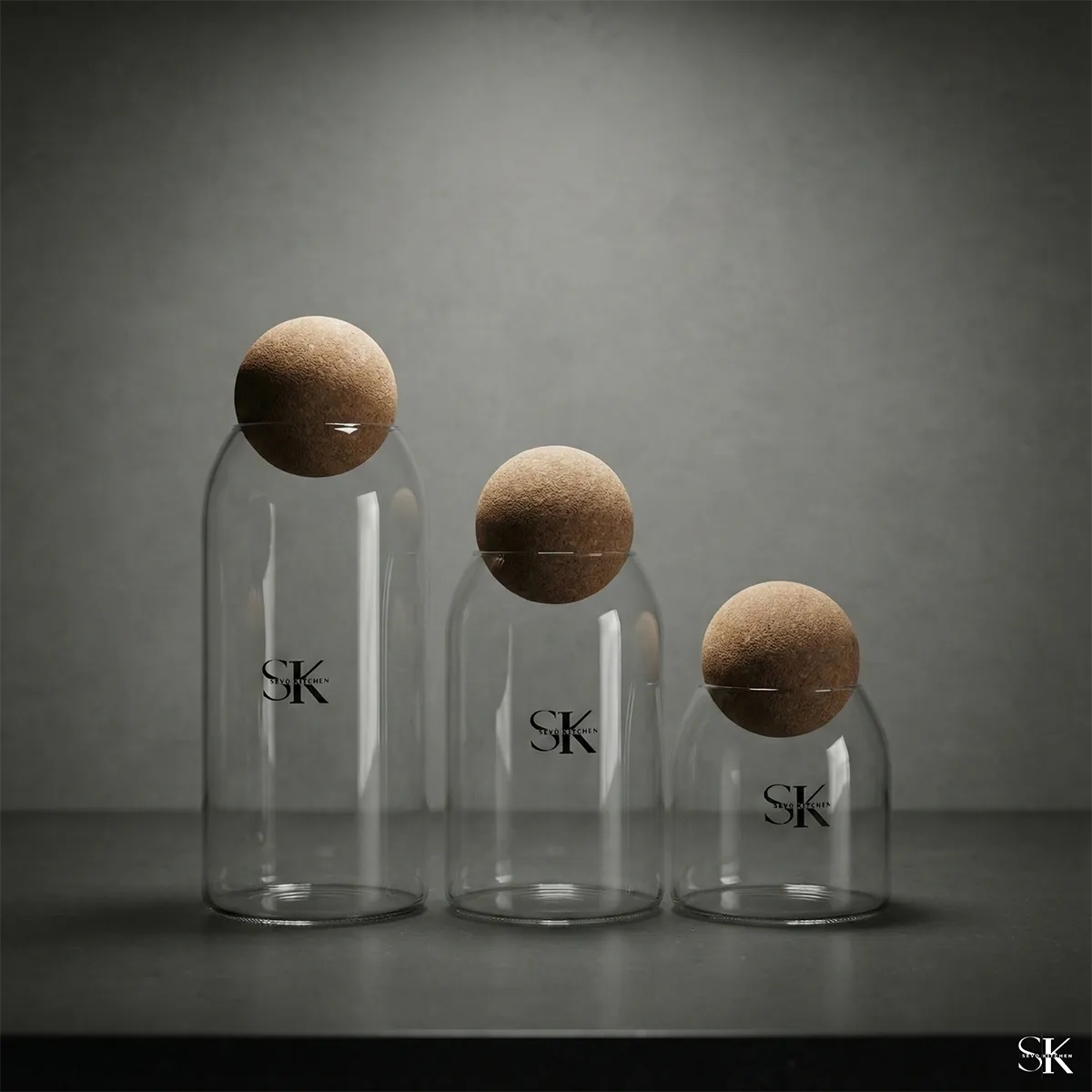 طقم Glas Trio هو طقم زجاجي أنيق يتكوّن من ثلاث عبوات متناسقة تأتي مع أغطية خشبية كروية فاخرة، ليجمع بين البساطة والعملية في تصميم عصري يضيف لمسة راقية لأي مطبخ.