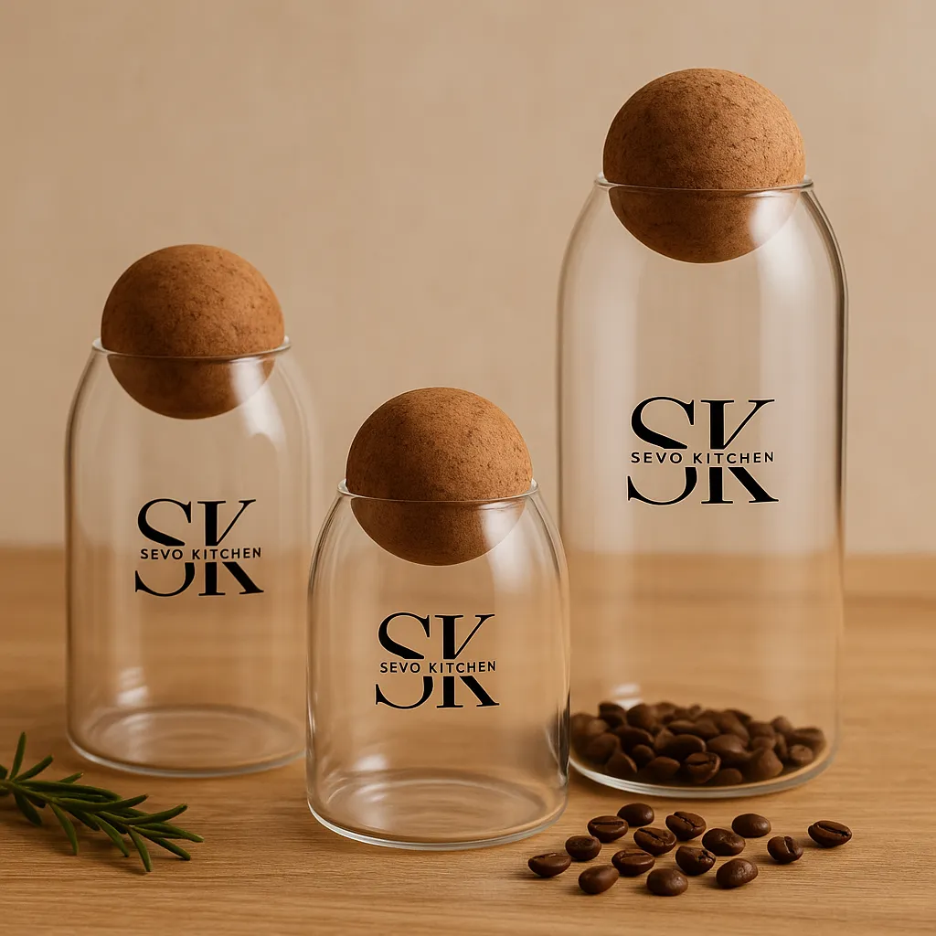 تأتي العبوات بزجاج شفاف عالي الجودة يتيح رؤية المحتوى بسهولة، بينما تضيف الأغطية الخشبية الكروية مظهراً دافئاً وطبيعياً مع إغلاق محكم يحافظ على الطزاجة والنكهة.