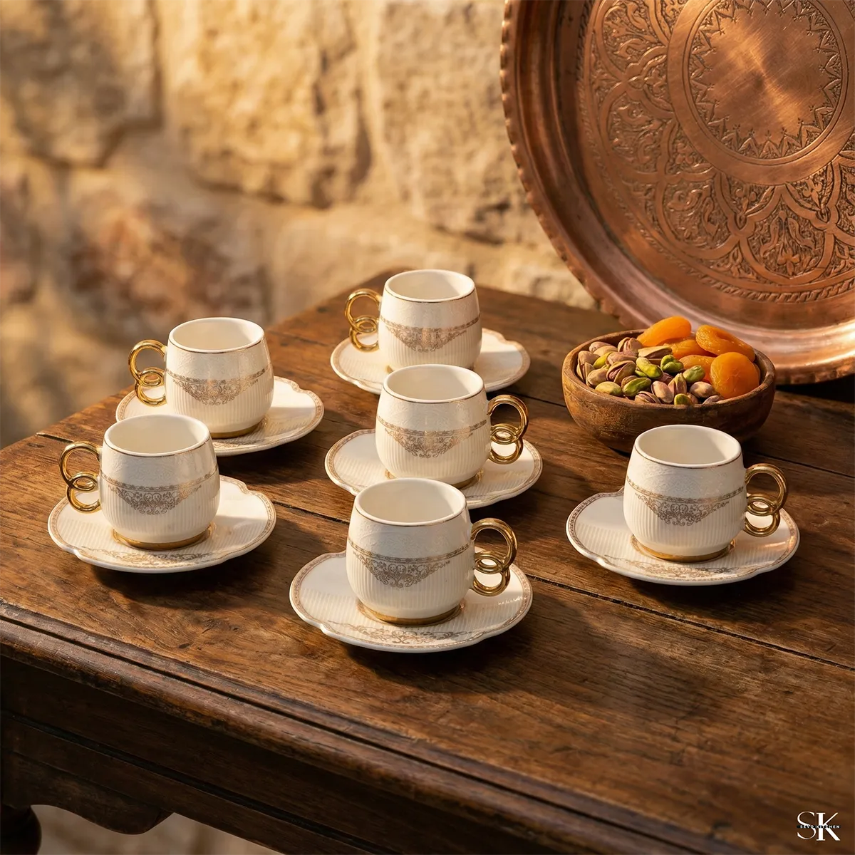طقم فناجين قهوة جلوريا هو طقم أنيق مكوّن من 6 فناجين مع 6 صحون، بتصميم يجمع بين الرقة والفخامة.