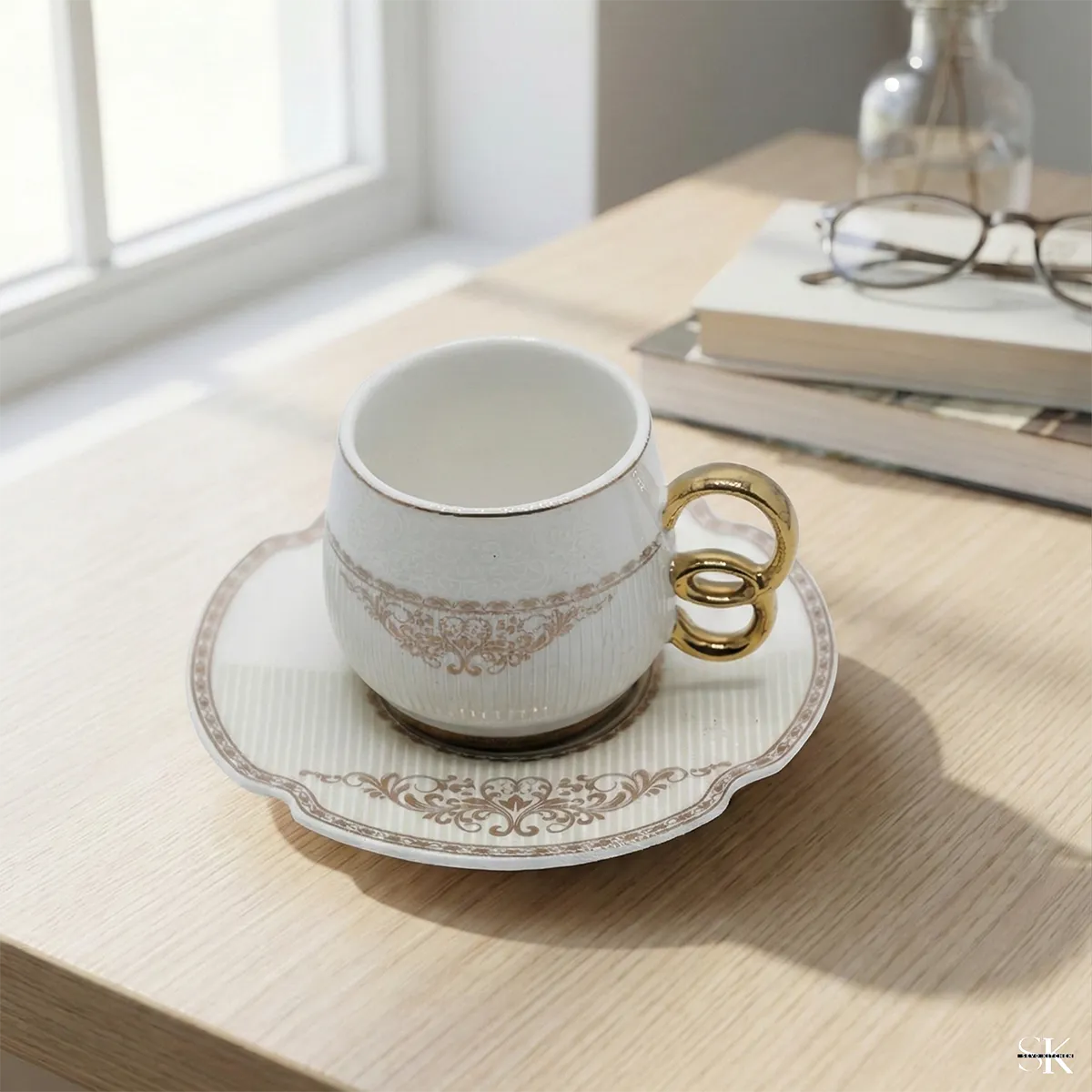 يتميز الفنجان بمقبض ذهبي مزدوج يمنح شكلًا فاخرًا وسهولة في الإمساك، بينما يأتي الصحن بحافة متموّجة مع زخارف متناسقة تكمل جمال التصميم.