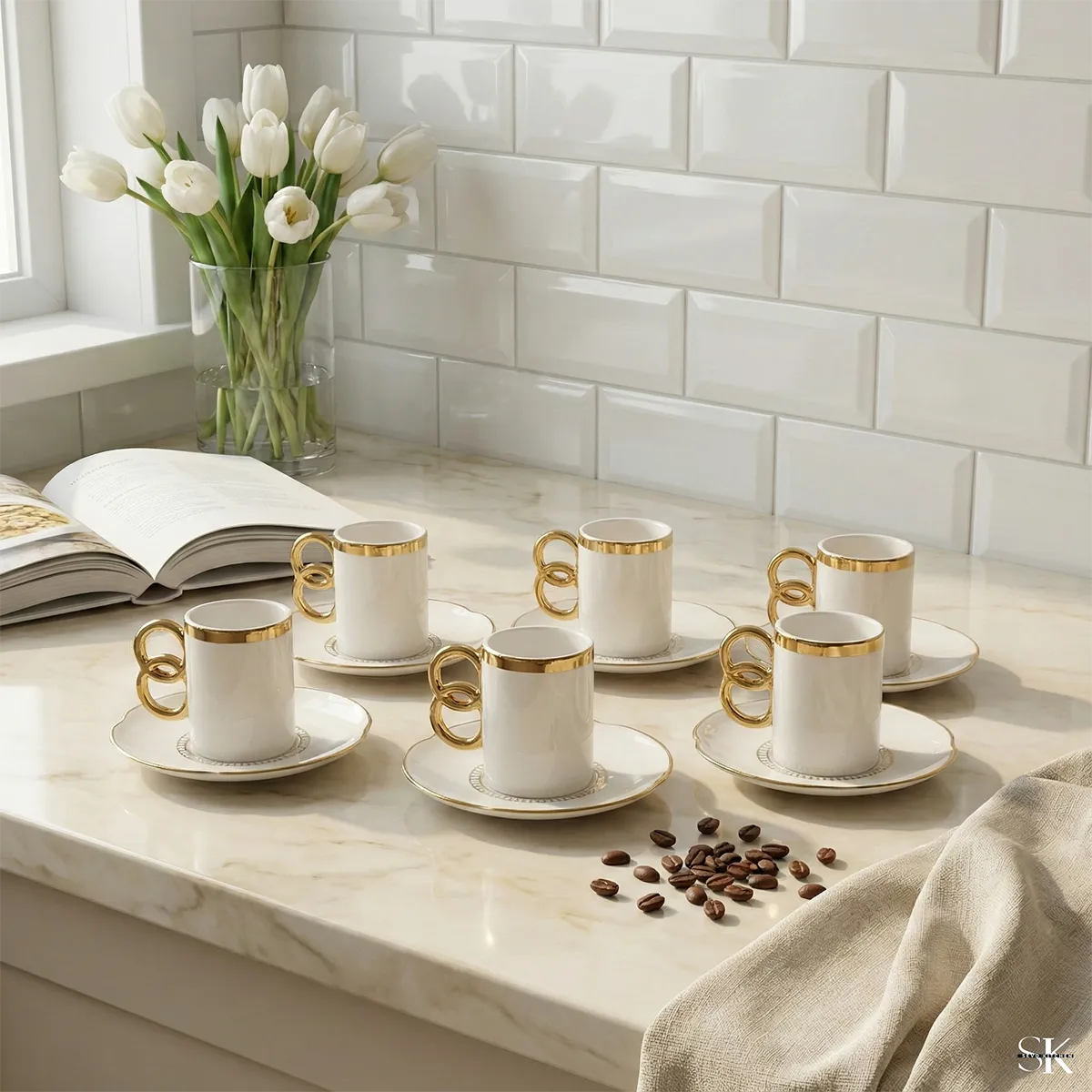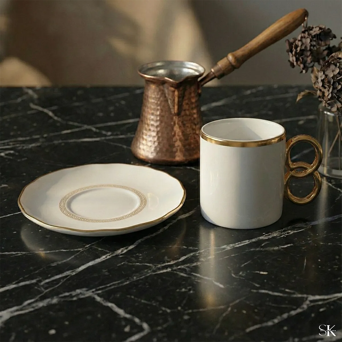 تأتي الفناجين باللون الأبيض مع نقوش ذهبية لامعة تضيف لمسة راقية إلى الطقم، بينما يتميز كل فنجان بـ تصميم مزدوج ومتداخل عند المسكة يمنحه شكلاً فريدًا ولافتًا.