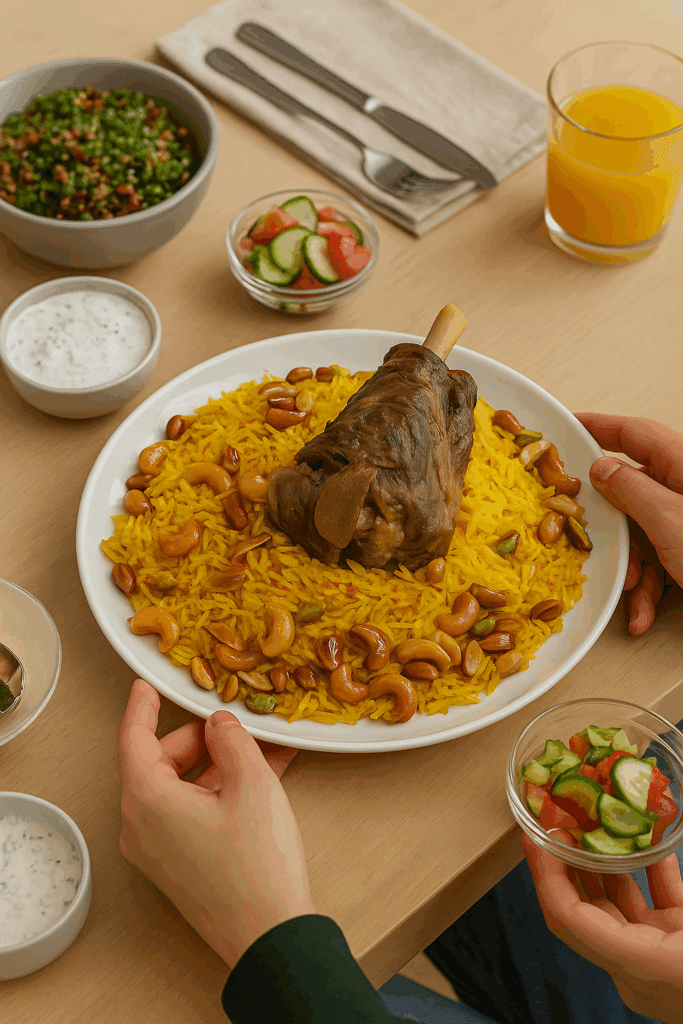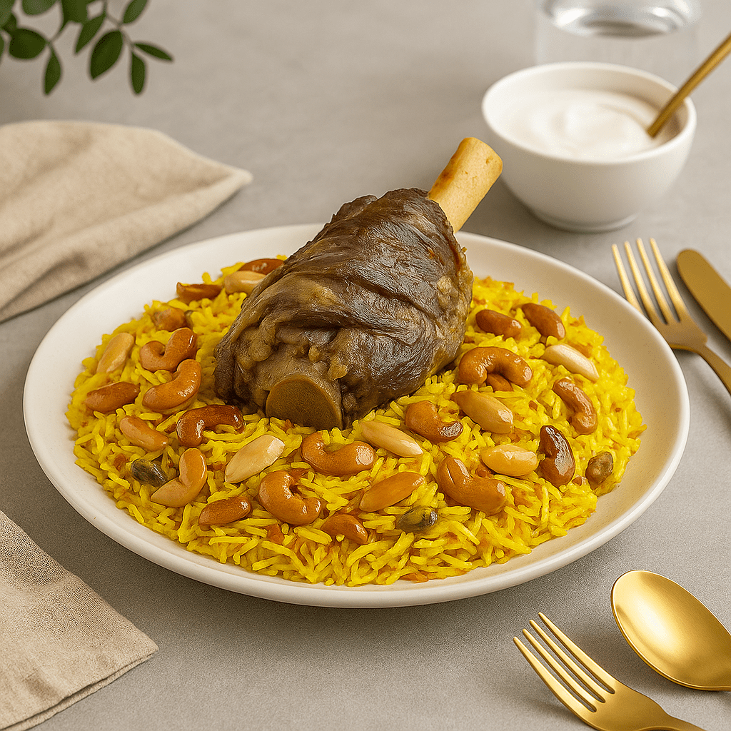 Place a layer of rice on the serving dish and arrange the lamb shanks on top.